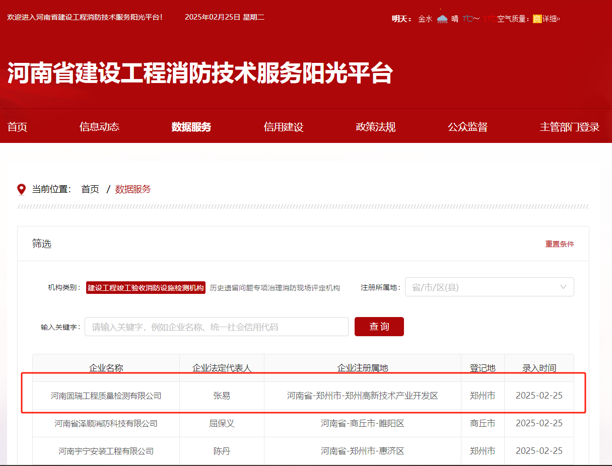 熱烈祝賀河南固瑞工程質(zhì)量檢測有限公司入冊河南省建設(shè)工程消防技術(shù)服務(wù)陽光平臺!??!